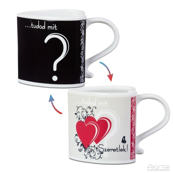 - Magiczny kubek: dzięki specjalnej farbie nadruk na kubku zmienia wygląd pod wpływem ciepła. Po wystygnięciu lub zalaniu zimną wodą wraca do stanu początkowego. W przeciwieństwie do innych termoczułych kubków, ten kubek zmienia wygląd na całej powierzchni. Nadruk wokół całego produktu. Napis na produkcie: Tudod mit? Szeretlek. Produkt w węgierskiej wersji językowej. Materiał: porcelana. Wymiary: 8,5 cm (wysokość), 300 ml (pojemność). Nadaje się do kontaktu z żywnością. Produkt jest chroniony zarejestrowanym znakiem towarowym. Produkt bezpieczny